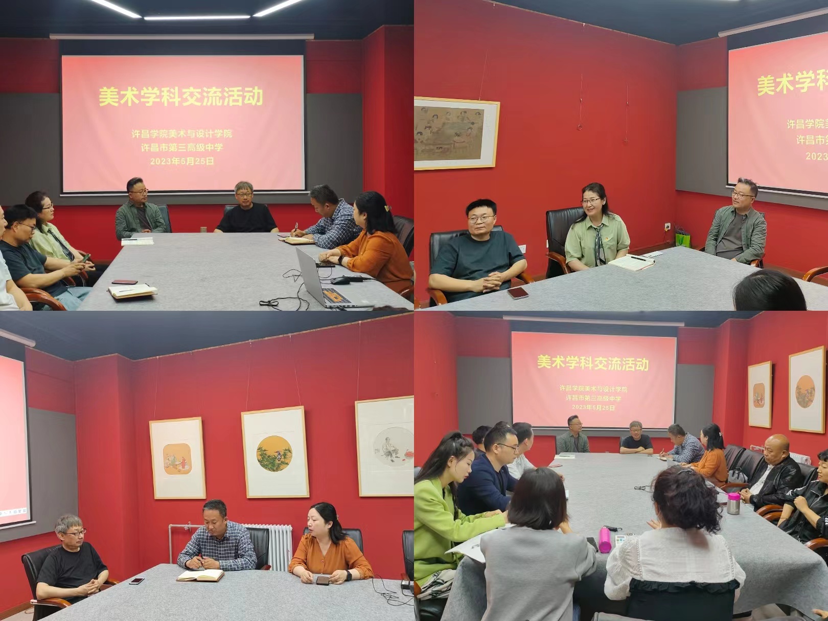 5月25日上午,我院与许昌市第三高级中学在河南区域美术研究中心成功开展“美术学科协同育人交流活动”。美术与设计学院党委书记闫爱敏,美术与设计学院院长、许昌学院钧瓷文化与产业研究中心主任、许昌市美术家协会主席张少华,副院长韩鸿友,美术系主任赵韶峰,副主任杨璐,油画教研室副主任王萌,国画教研室副主任李岩,李海鹏博士以及市三高美术组教研室主任刘亚娟,高级教师宋兵及部分市三高一线美术教师出席会议。