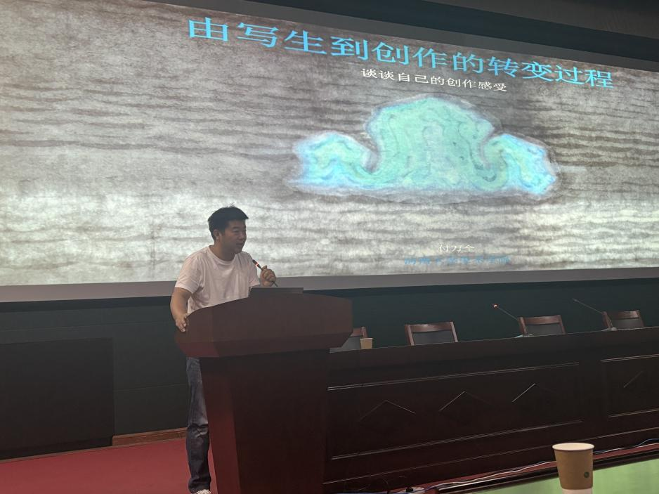 付博士从绘画要探索并建立自己的语言样式展开,通过自身写作实践,讲述绘画不仅是视觉表达的载体,更应成为艺术家个体精神与时代语境的对话工具。他提出,在全球化与数字技术深刻介入艺术创作的今天,艺术家亟需突破既定传统框架,建立独特的语言样式,以实现艺术表达的深度革新。关于如何突破已有传统艺术语言,付博士通过探索证明,艺术语言的创新不是对传统的背离,而是在更复杂维度上的延续与再生。