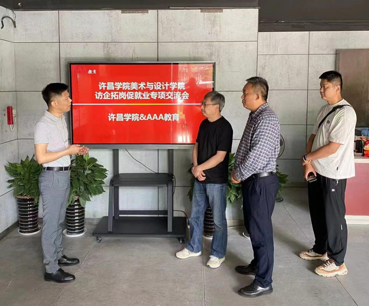 根据《教育部办公厅关于开展2023届高校毕业生春季促就业攻坚行动的通知》要求,我院积极响应我校深入集中开展”访企拓岗促就业”行动号召。5月24日,院长张少华、副院长韩鸿友、办公室主任陈站、毕业班辅导员赵鹏飞一行来到郑州漫动者数字科技有限公司(AAA数字艺术教育)进行走访调研,深入开展访企拓岗促就业专项行动。