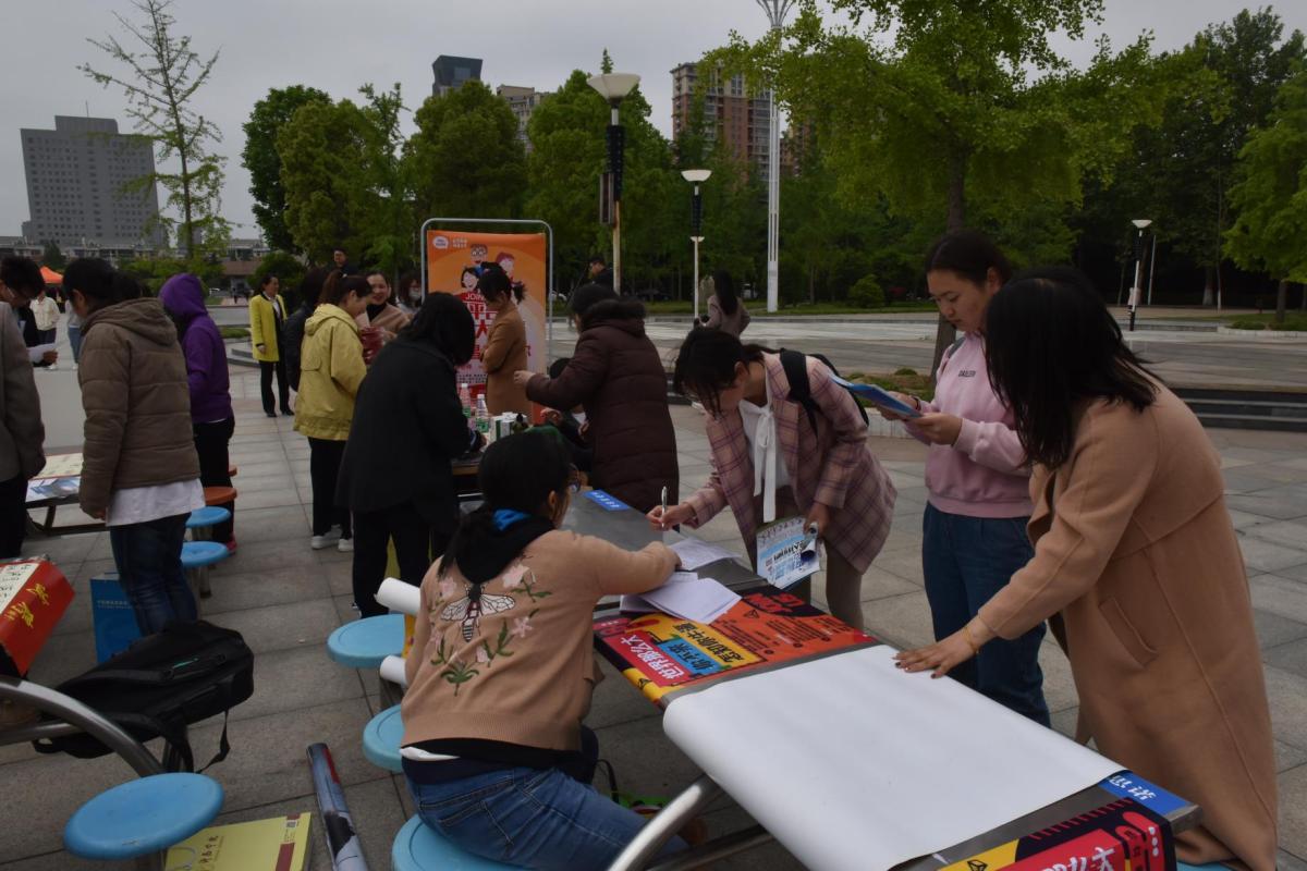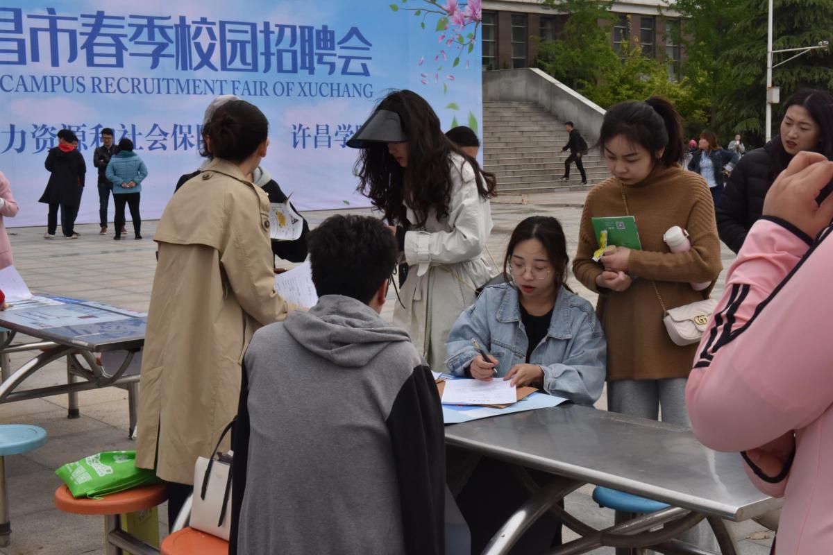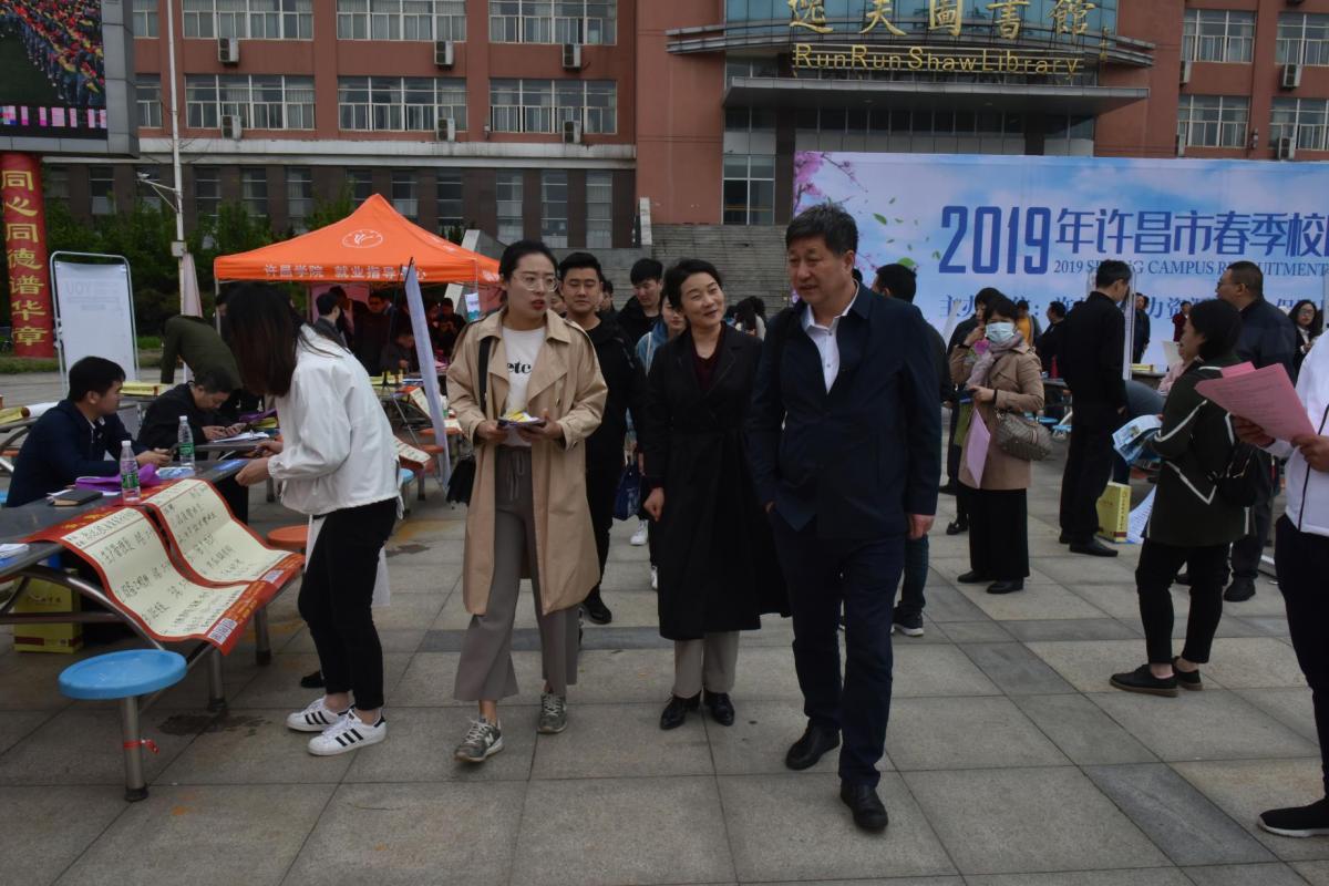 4月25日,由许昌市人力资源,社会保障局与许昌学院联合举办的许昌市2019届高校毕业生春季供需洽谈会在弘毅广场举行。美术学院积极组织临近毕业的学生前往参加此次招聘会,党总支书记马忠、党总支副书记吴艳艳和辅导员杨晨老师前往招聘会进行考察。