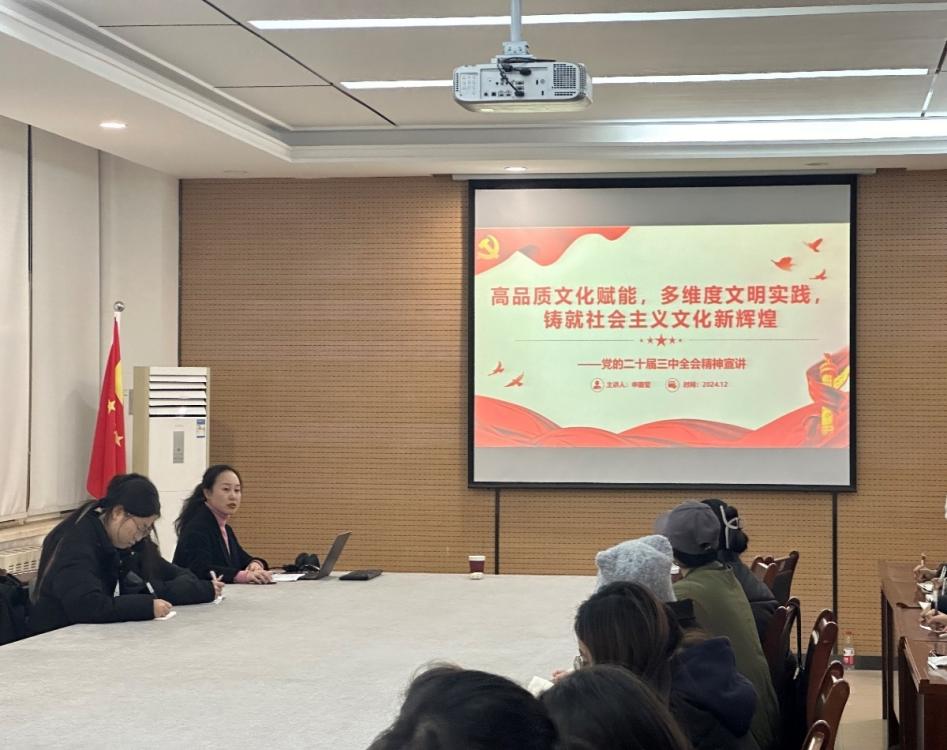 12月10日晚,校党委宣讲团成员、校党委宣传部副部长申璐莹应邀在艺术楼三楼会议室做了题为“高品质文化赋能,多维度文明实践,铸就社会主义文化新辉煌”的报告。我院组织员和32期入党积极分子参加会议。