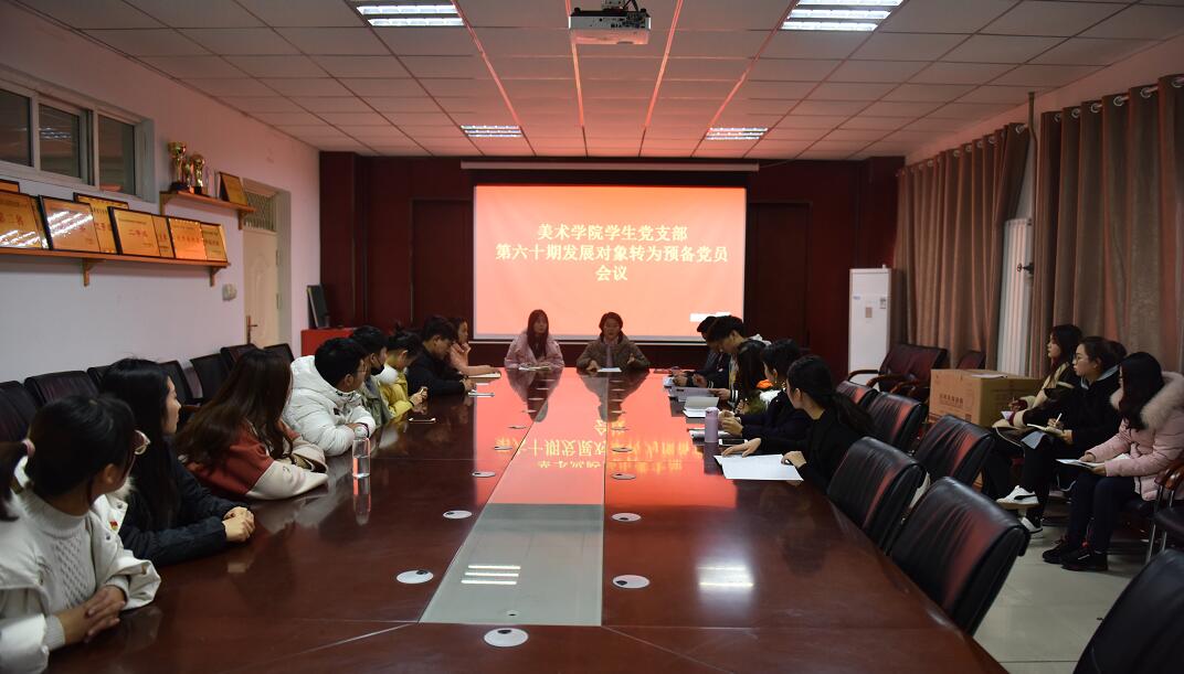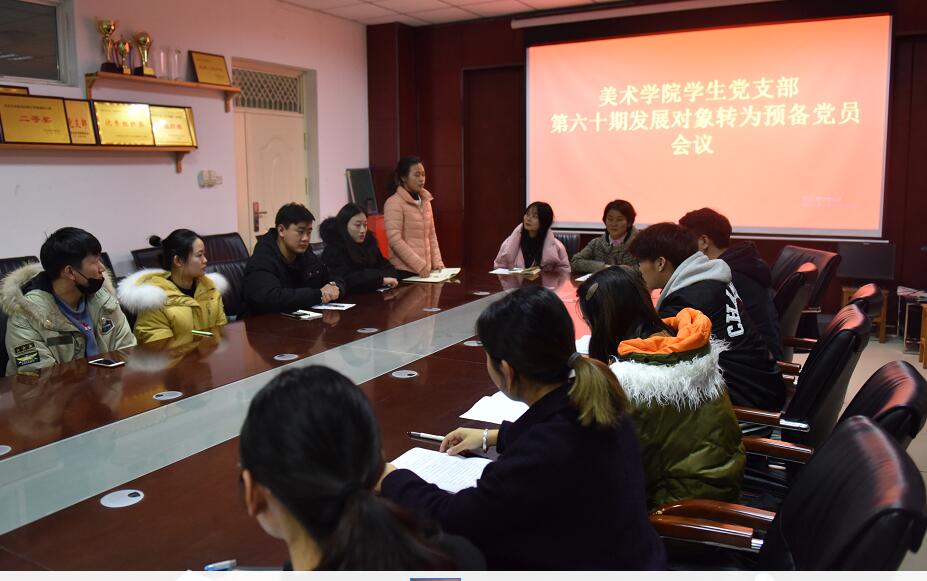 12月11日下午,美术学院学生党支部第六十期发展对象转为预备党员会议在艺术楼422会议室召开。由美术学院学生党支部书记杨璐主持。美术学院党总支副书记吴艳艳、学生党支部全体党员和五位发展对象参加了本次会议。