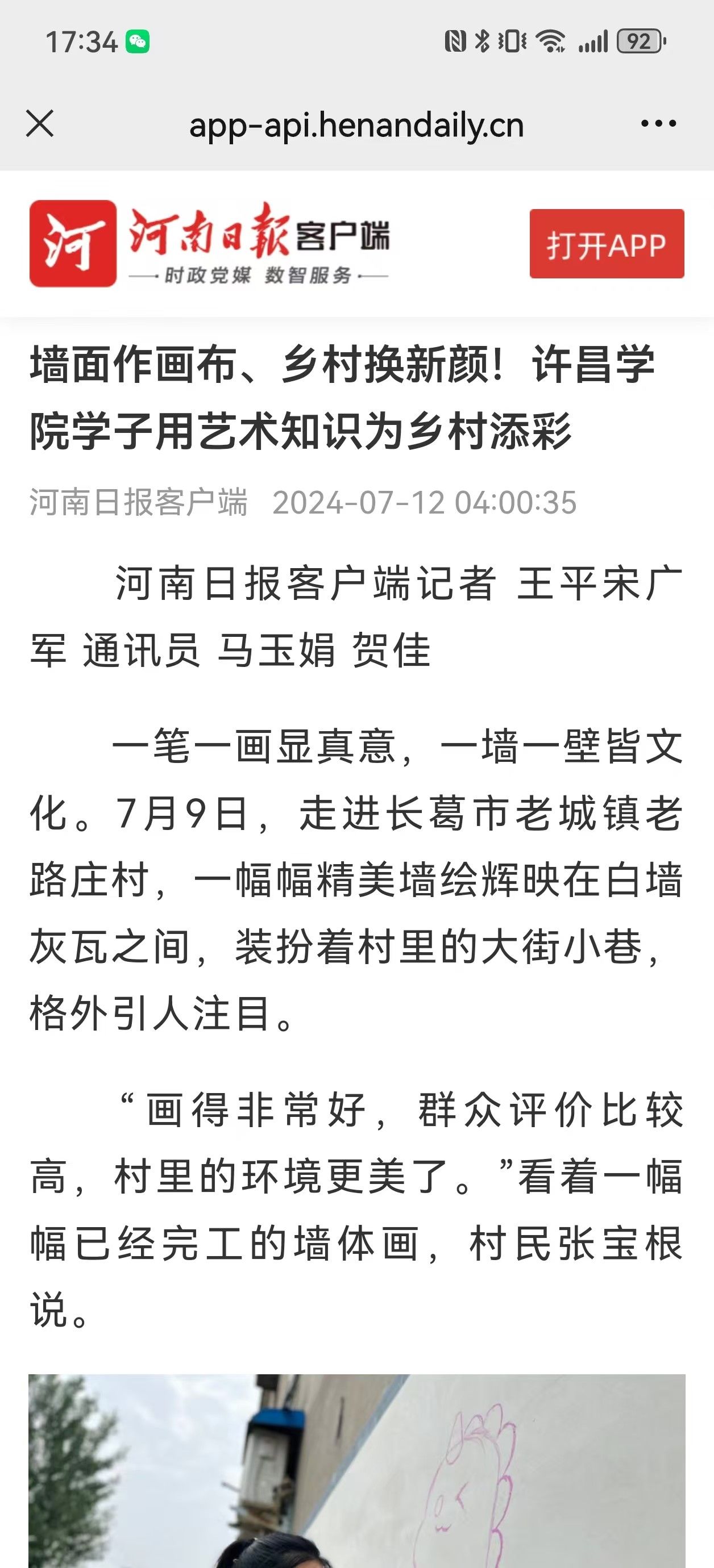 经开展墙体彩绘及后续系列实践活动,村庄面目焕然一新,有效提升了乡村环境的整洁度与美观度,使村庄在传统风貌与现代美学的交融中焕发新生。活动获河南省教育厅、豫教思语、大学之大、大河报等多个省、市级平台报道,并形成示范效应,周边多个村庄提出合作意向。