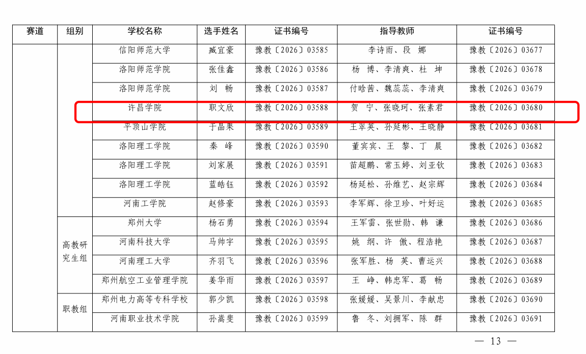 近日,河南省教育厅公布了第三届全国大学生职业规划大赛河南省赛获奖名单,我院学子职文欣凭借清晰的职业规划、扎实的专业素养与出色的现场表现,斩获就业赛道金奖;贺宁、张晓珂、张素君三位老师获“优秀指导教师”称号,这也是我校首次实现该类赛事省赛金奖突破。