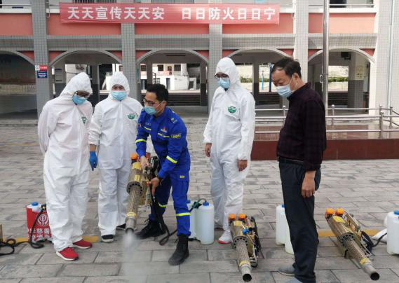 宦途飞同志讲解消毒枪的用法 宦途飞同志在搬运新到的抗疫用品