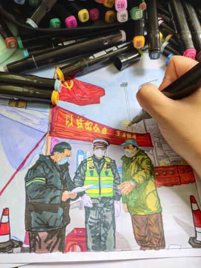 而有一些队员则根据自己的所见所闻、所感所悟,绘制出了许多精美的绘画作品。不少队员们以疫情期间留下的照片作为参考,描绘了人们从货车上搬下物资、身着防护服的工作人员为学校教室消毒、坚守在执勤哨卡的民警为百姓耐心解答问题、医护人员向痊愈出院的病人挥手告别等多个场景,水彩、素描、速写、版画······虽然大家运用的绘画手法各不相同,却同样表达出大家对疫情期间坚守工作岗位的工作者的敬佩之情。实践队还举办了优秀画作的线上展览,细腻的笔触,精湛的画技,一幅幅画作因为饱蘸着大家的感动与爱,展现出了强大的感染力和生命力。