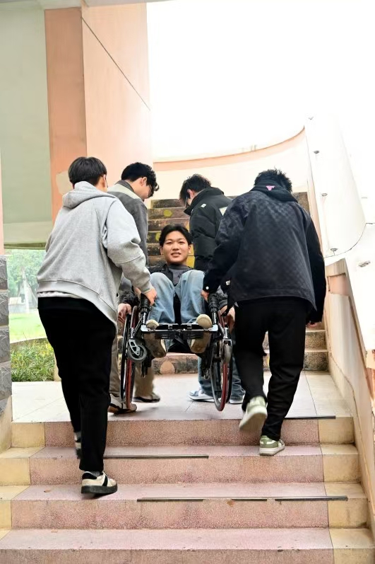军训结束,大学生活正式开始。英语课教室在2楼,室友们就合力把他抬到楼上。下课后,室友们继续抬着他去别的教室。