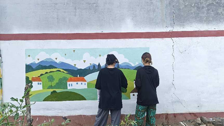 今天的任务是对昨天起稿的墙面进行涂色,队员们齐心协力,分工明确,从设计构思到色块填色,每一个环节都倾注着队员们的辛勤汗水。面对绘制过程中的难题,他们共同深讨、一一攻克。经过一笔一划,一涂一抹,色彩在墙上逐渐绽放,不少村民都驻足观赏这一幅幅靓丽的风景。