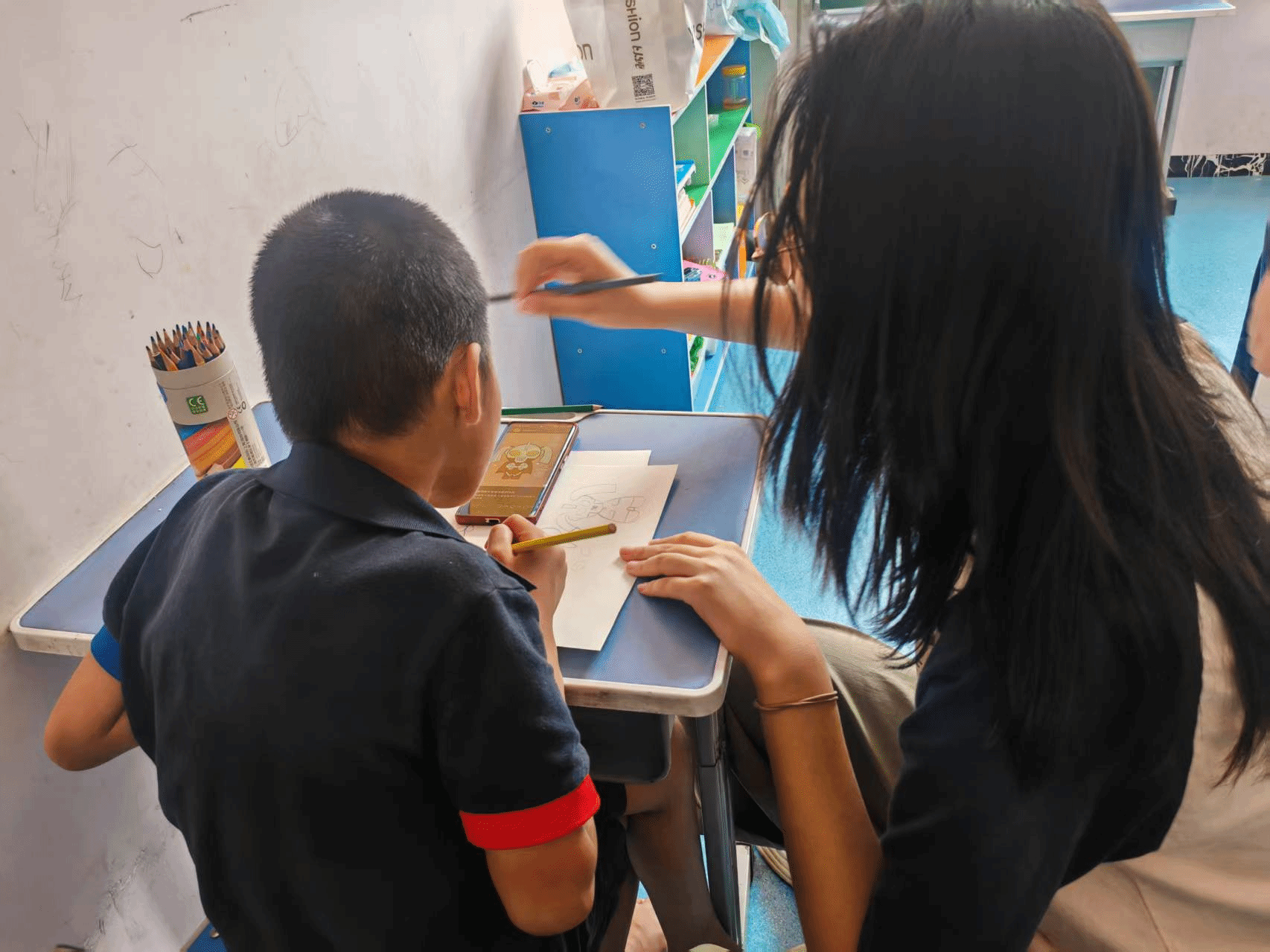 活动中,队员们根据孩子们的特点设计了简单有趣的绘画课程,并准备了彩笔、蜡笔和画纸。面对一些内向的孩子,团队成员耐心引导,用温和的话语鼓励他们大胆创作。从简单的线条涂鸦到色彩斑斓的图案,孩子们慢慢展现出对绘画的热情。